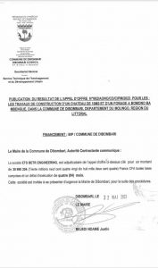 Pour les travaux de construction d’un château de 10m3 et d’un forage a Bomono ba Mbengue, dans la commune de Dibombari. Département du Moungo. Région du Littoral. Un financement bip / Commune de Dibombari. Un budget de 31.0 millions Fcfa.