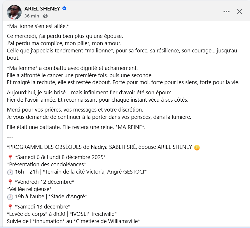 Décédée le 3 décembre 2025 à Abidjan, Nadiya Sabeh laisse derrière elle 13 années d’amour, de complicité et de vie partagée avec l’artiste ivoirien Ariel Sheney, qu’elle avait épousé le 7 décembre 2024. Diagnostiquée d’un cancer du sein en février 2024, elle avait mené un combat qu’elle partageait avec ses fans. Ariel Sheney avait officialisé sa maladie le 10 août 2024, révélant que Nadiya se battait depuis plus d’un an déjà contre une tumeur particulièrement agressive.