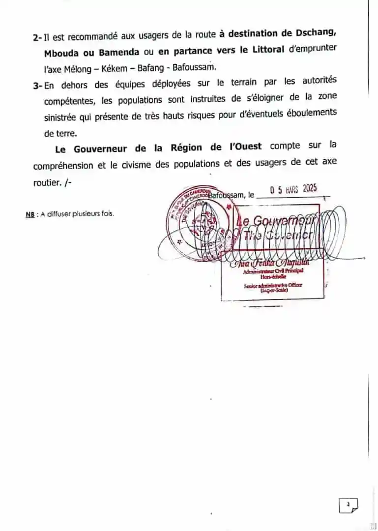 Les autorités conseillent aux usagers de la route, empruntant la direction de Dschang, Mbouda, Bamenda ou le littoral, de prendre l’axe Mélong-Kékem-Bafang-Bafoussam en attendant la réouverture de la route.