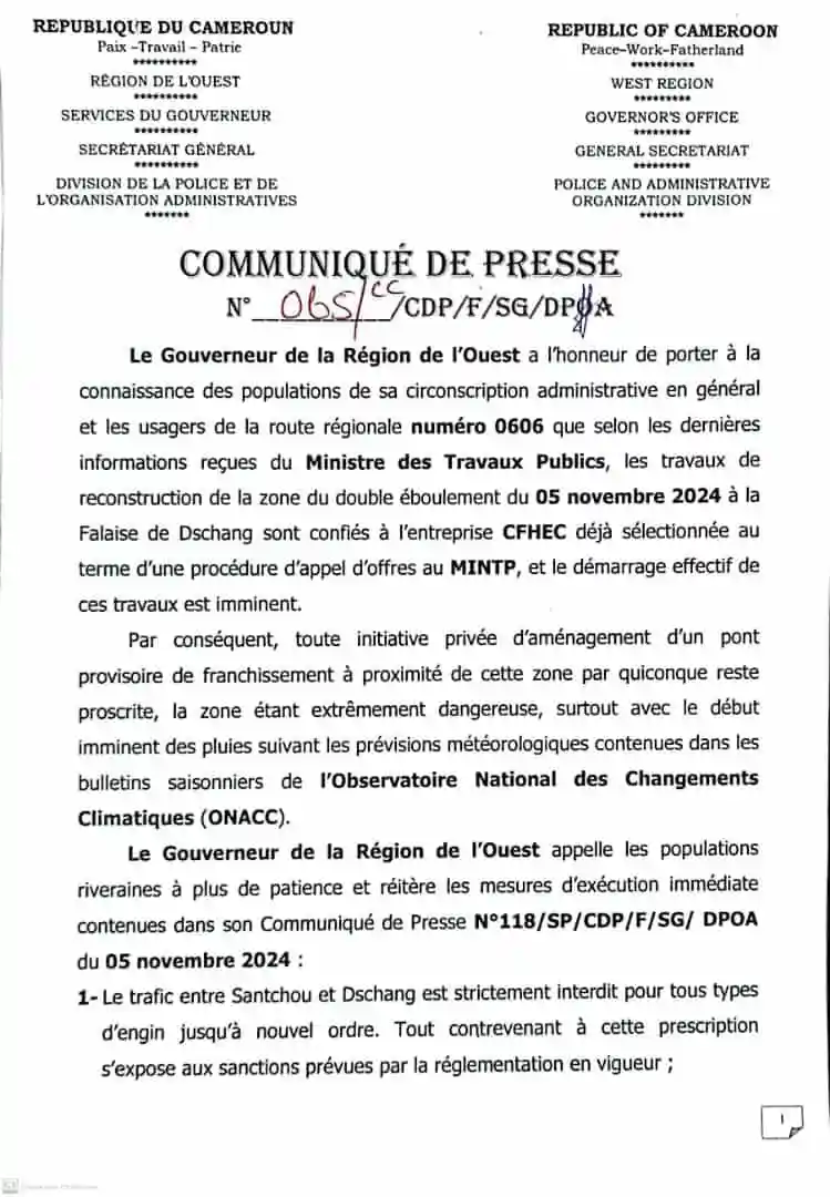 Le gouverneur de la région de l’Ouest a rappelé que la zone reste extrêmement dangereuse. Plus encore avec l’arrivée imminente des pluies, comme l’indiquent les prévisions de l’Observatoire National des Changements Climatiques (Onacc). Ainsi, il a interdit strictement toute construction d’un pont provisoire dans la zone et a ordonné la suspension du trafic entre Santchou et Dschang.