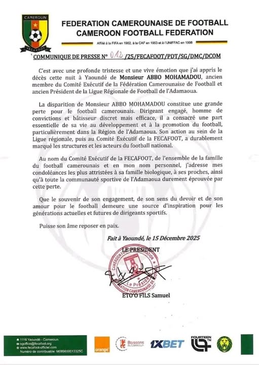 Ancien membre du Comité exécutif de la Fécafoot et ex-président de la Ligue régionale de l’Adamaoua, Abbo Mohamadou est décédé à Yaoundé ce 15 décembre 2025. La Fédération camerounaise de football salue la mémoire d’un dirigeant engagé, respecté et profondément attaché au développement du football national.