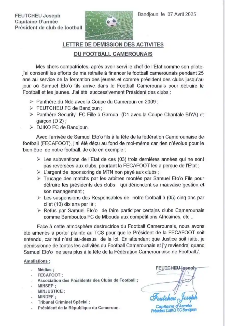 Le climat au sein du football camerounais est devenu insoutenable pour Joseph Feutcheu. « Avec Samuel Eto’o à la tête de la Fecafoot, rien n’avance. Les clubs ont été contraints de saisir la justice face à des malversations », précise-t-il dans sa lettre. En outre, l’ex-président de Djiko Fc évoque la suspension abusive de responsables du football national, ainsi que l’exclusion de certains clubs des compétitions africaines, à l’instar de Bamboutos Fc de Mbouda.