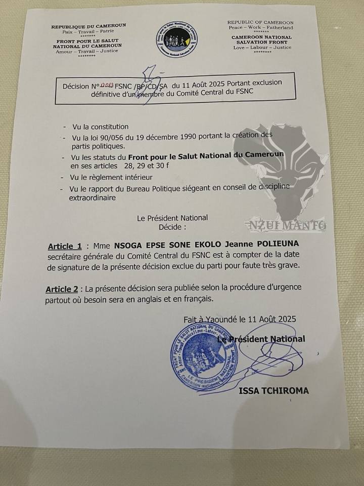 Le Front pour le Salut National du Cameroun (Fsnc) a exclu Jeanne Nsoga le 11 août 2025. La décision est signée d’Issa Tchiroma Bakary, président du parti qui évoque une faute « très grave ».