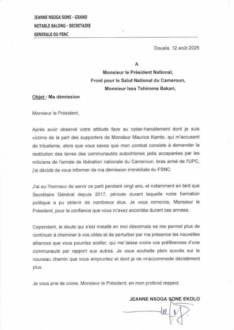 Le lendemain de son exclusion, Jeanne Nsoga adresse sa lettre de démission. « J’ai décidé de vous informer de ma démission immédiate », écrit-elle. Elle reproche au président du Fsnc son silence face au « cyberharcèlement » dont elle se dit victime, et évoque une préférence communautaire voilée : « Le doute qui s’est installé en moi ne me permet plus de continuer à cheminer à vos côtés. » L’ex-secrétaire générale revendique 20 années de loyauté, dont huit à la tête du secrétariat général. « J’ai eu l’honneur de servir ce parti pendant vingt ans, et notamment en tant que Secrétaire Général depuis 2017, période durant laquelle notre formation politique a pu obtenir de nombreux élus ». Aujourd’hui, elle quitte un parti en pleine période électorale. Elle qui se disait, il y a quelques jours encore, satisfaite de la validation du dossier du Fnsc par Elécam.