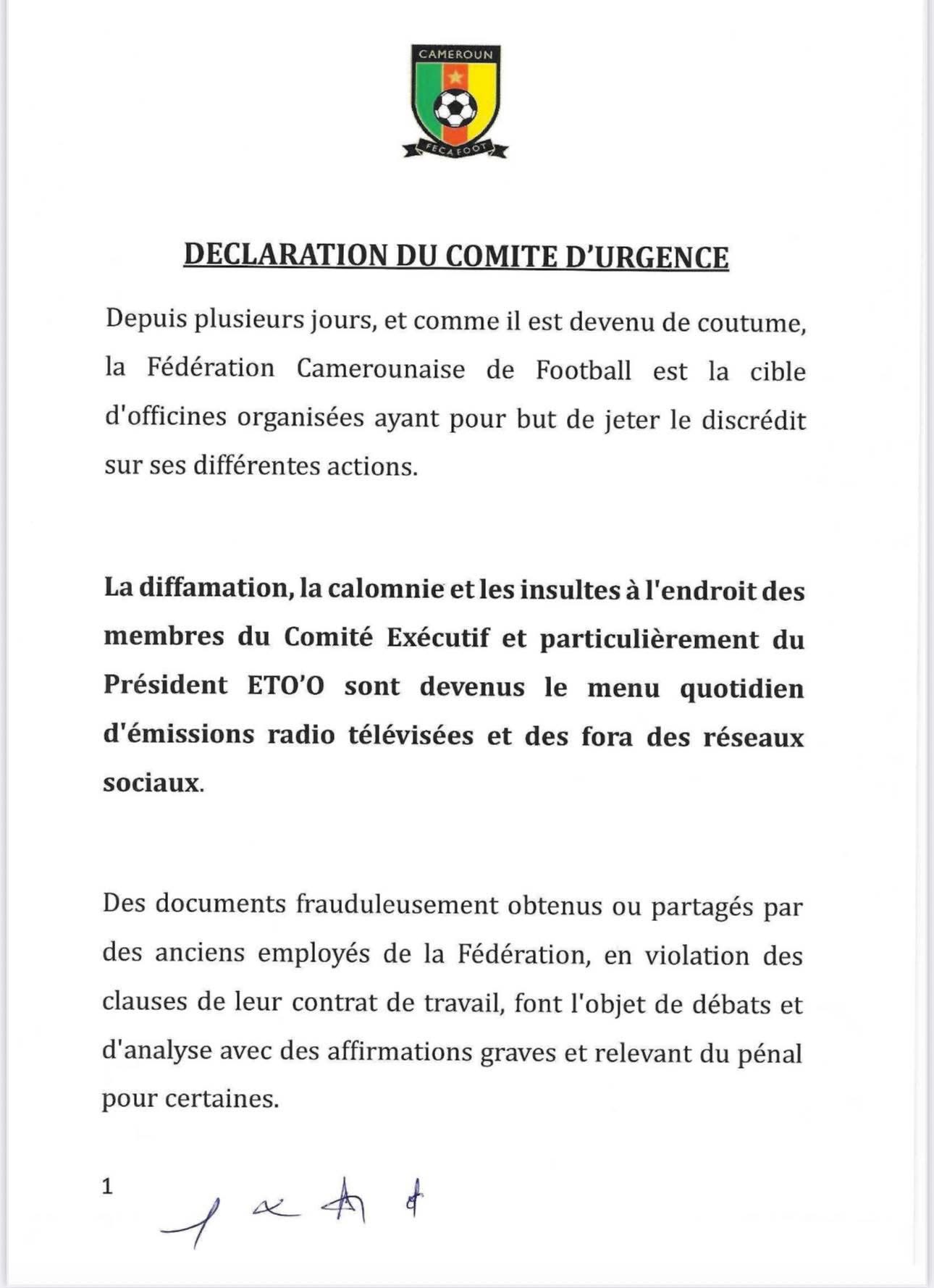 Ci-dessous l’intégralité de la Déclaration du Comité d’urgence de la Fecafoot: