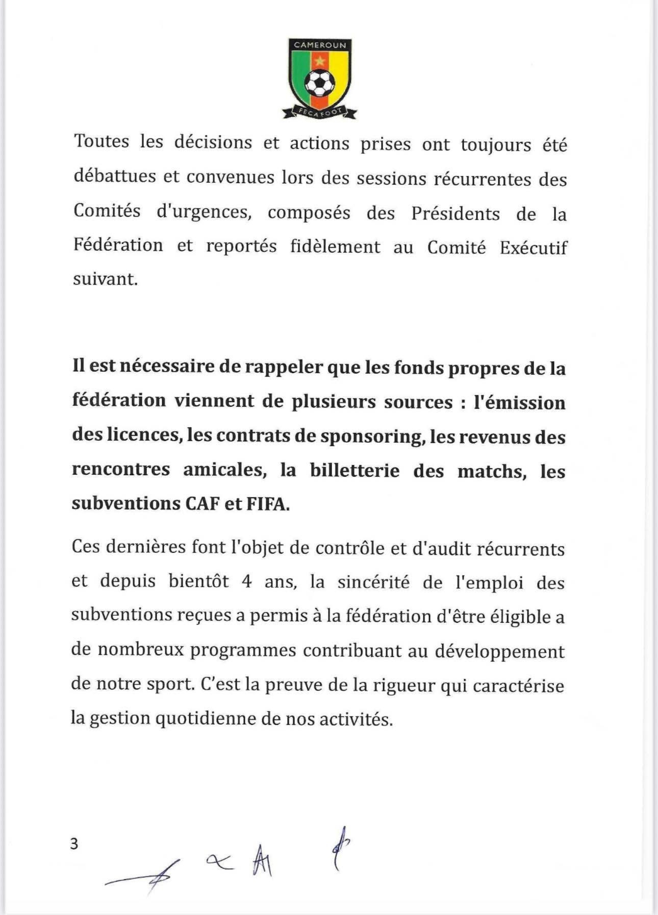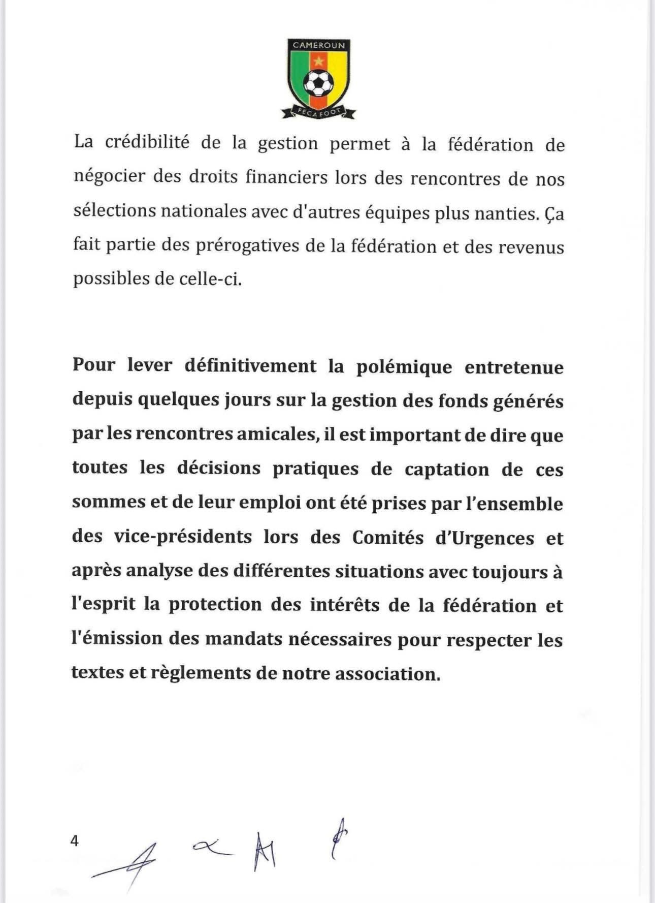 Face à ces accusations, la Fecafoot dénonce une tentative de « salir l’honorabilité » de ses dirigeants. Dans son viseur, des accusations relayées dans les médias et sur les réseaux sociaux. Elle affirme que les fonds générés par les matchs amicaux sont gérés collectivement. « Pour lever définitivement la polémique entretenue depuis quelques jours sur la gestion des fonds générés par les rencontres amicales, il est important de dire que toutes les décisions pratiques de captation de ces sommes et de leur emploi ont été prises par l’ensemble des vice-présidents lors des Comités d’Urgences. Et après analyse des différentes situations avec toujours à l’esprit la protection des intérêts de la fédération et l’émission des mandats nécessaires pour respecter les textes et règlements de notre association », rappelle le communiqué.