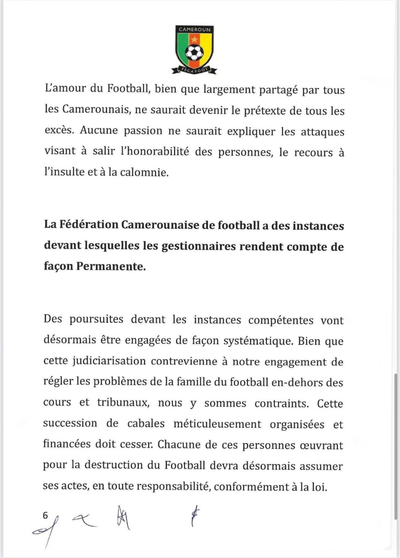 La Fecafoot annonce qu’elle saisira désormais la justice en cas d’attaques. «Cette succession de cabales méticuleusement organisées et financées doit cesser. Chacune de ces personnes œuvrant pour la destruction du Football devra désormais assumer ses actes, en toute responsabilité, conformément à la loi.», avertit-elle.