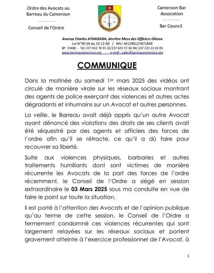 Cette décision fait suite à une vidéo choquante qui a circulé sur les réseaux sociaux le 1er mars 2025. Celle-ci montrait des policiers infligeant des violences à un avocat et à d’autres citoyens. Le Barreau du Cameroun ne supporte plus ces actes jugés inacceptables et demande un respect total pour ses membres. Le bâtonnier Mbah Eric Mbah, lors d’une session extraordinaire le 3 mars 2025, a dénoncé ces violences inhumaines. Il a aussi révélé qu’un autre avocat avait été séquestré par la police. « La veille, le Barreau avait déjà appris qu’un autre avocat ayant dénoncé des violations des droits de ses clients avait été séquestré par des agents et officiers des forces de l’ordre afin qu’il se rétracte, ce qu’il a dû faire pour recouvrer la liberté ».