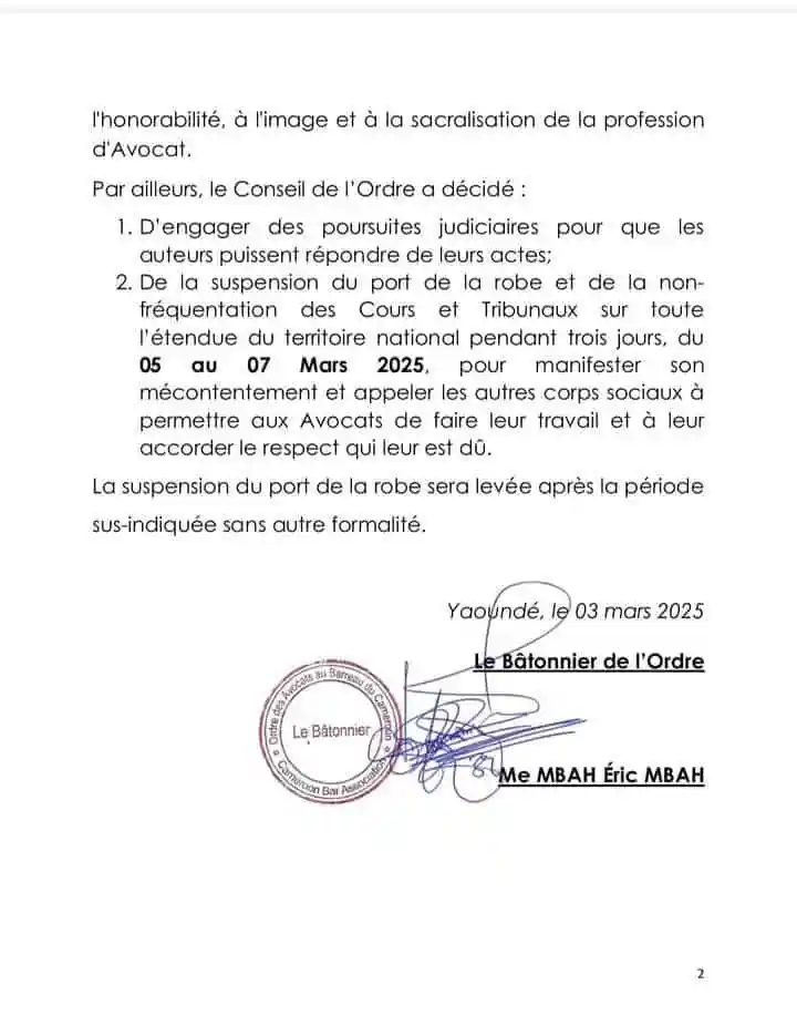 En réponse à ces incidents, le Conseil de l’ordre a décidé de suspendre les avocats de toute activité judiciaire. Ceci à partir de ce 05 mars, et se poursuivra jusqu’au 7 mars 2025. Les avocats se retireront des tribunaux et suspendront le port de la robe. Cette grève vise à manifester le mécontentement de la profession. A appeler à une plus grande protection et reconnaissance des avocats.