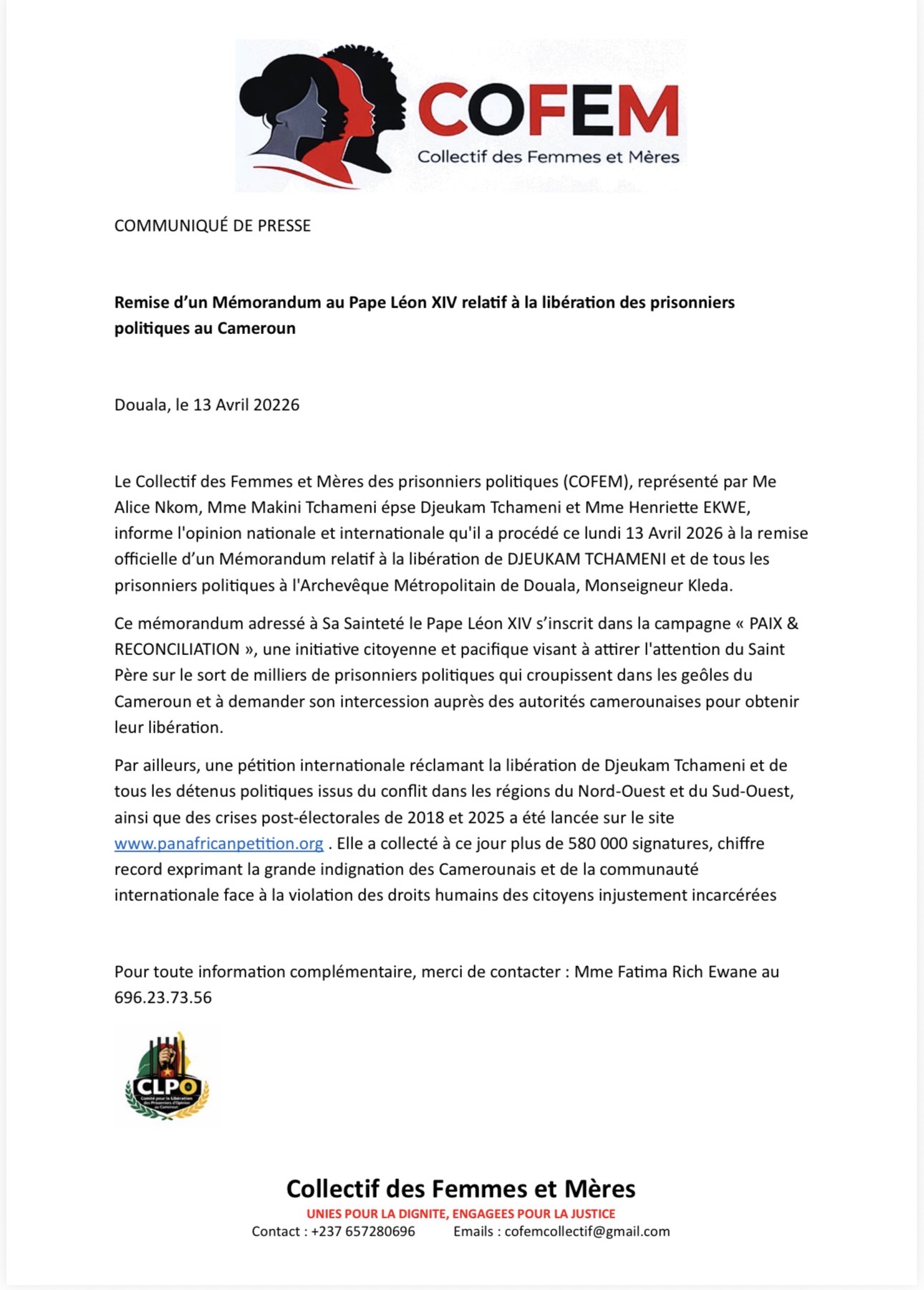 Le Collectif des Femmes et Mères des prisonniers politiques (Cofem) a officiellement remis, le 13 avril à Douala, un mémorandum destiné au pape Léon XIV. Le document a été transmis par l’intermédiaire de l’archevêque métropolitain de Douala, Monseigneur Samuel Kleda. Par ce geste, ces femmes entendent porter au plus haut niveau de l’Église catholique la question sensible des détenus politiques au Cameroun.