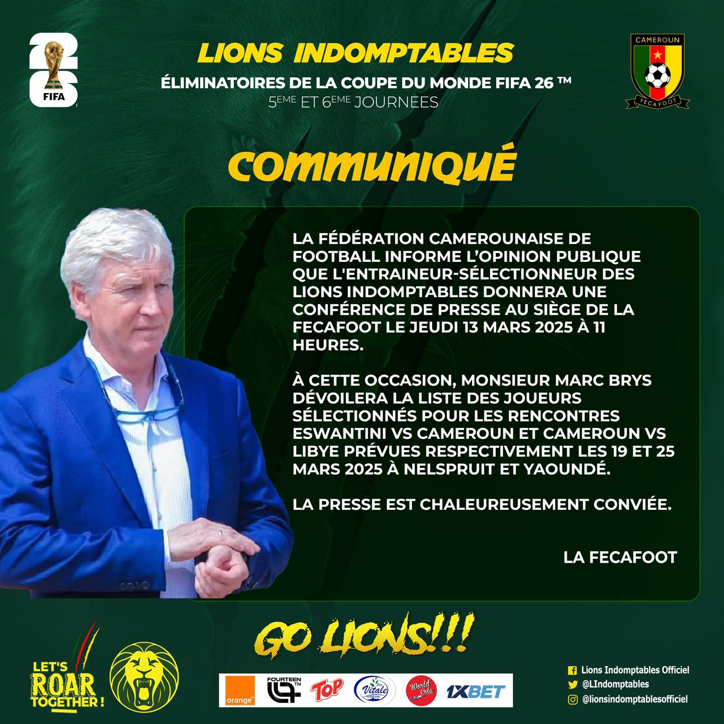 Ce jeudi 13 mars 2025, à 11 heures, Marc Brys, le sélectionneur des Lions Indomptables, dévoilera la liste des joueurs. Ils sont convoqués pour les rencontres cruciales des éliminatoires de la Coupe du monde 2026.