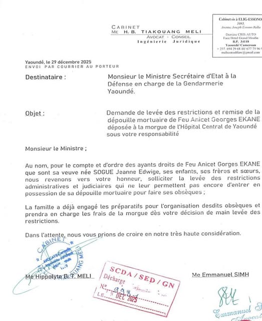 Ce 29 décembre 2025, la famille de Feu Anicet Georges Ekane a officiellement sollicité la levée des restrictions administratives et judiciaires qui empêchent toujours la remise de sa dépouille. La demande, adressée au Ministre Secrétaire d’État à la Défense en charge de la Gendarmerie, précise que les préparatifs des obsèques sont déjà engagés. La famille s’engage à prendre en charge les frais de la morgue dès que la décision sera rendue.