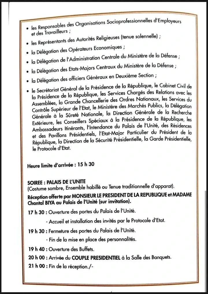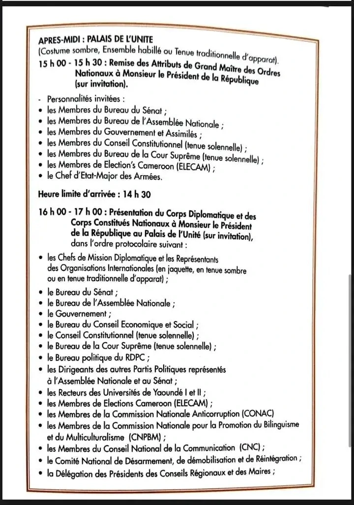 Le Cabinet civil de la Présidence de la République a rendu public, le 4 novembre 2025, le programme complet de la prestation de serment du président réélu, Paul Biya, prévue le jeudi 6 novembre au Palais de l’Assemblée nationale.