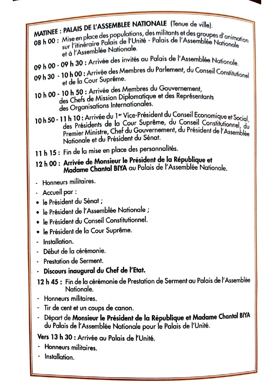 C’est désormais officiel. La cérémonie de prestation de serment du président Paul Biya se tiendra jeudi, 6 novembre 2025 au Palais de l’Assemblée nationale, à Yaoundé. Ainsi, les activités débuteront dès 8 heures avec la mise en place des populations, militants et groupes d’animation. Le chef de l’État est attendu à 12 h précises pour la prestation de serment, suivie de son discours inaugural et du tir de cent un coups de canon. Voici le programme officiel complet de cette journée, publié par le Cabinet civil de la Présidence de la République :