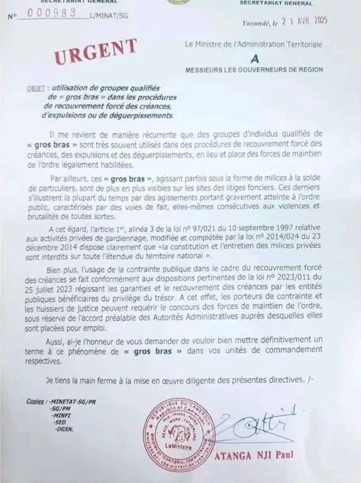 Paul Atanga Nji rappelle la loi. L’article 15, alinéa 3 de la loi n°97/021 du 10 septembre 1997 interdit « la constitution et l’entretien des milices privées sur toute l’étendue du territoire national. » Le ministre insiste aussi sur le rôle exclusif des forces de l’ordre très souvent remplacées par ces « gros bras ». « L’usage de la contrainte publique (…) se fait conformément aux dispositions pertinentes de la loi n°2023/011. » Désormais, seules les forces habilitées, sollicitées par les huissiers de justice, peuvent intervenir. Et ce, avec l’accord préalable des autorités administratives.