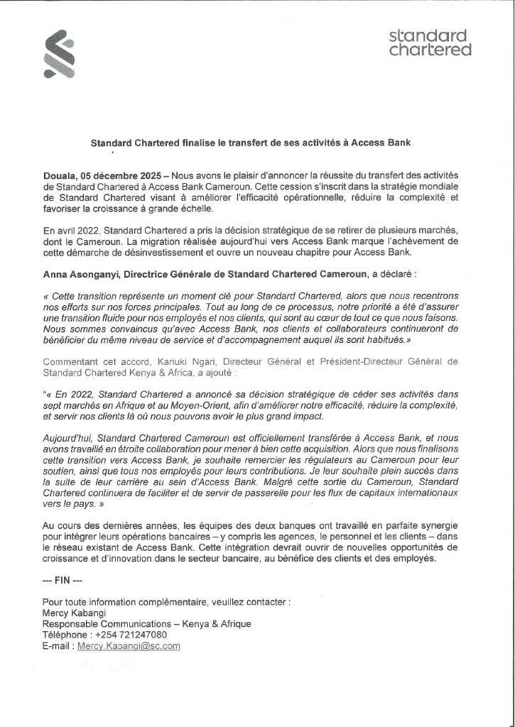 « Aujourd’hui, Standard Chartered Cameroun est officiellement transférée à Access Bank, et nous avons travaillé en étroite collaboration pour mener à bien cette acquisition. Alors que nous finalisons cette transition vers Access Bank, je souhaite remercier les régulateurs au Cameroun pour leur soutien, ainsi que tous nos employés pour leurs contributions ».