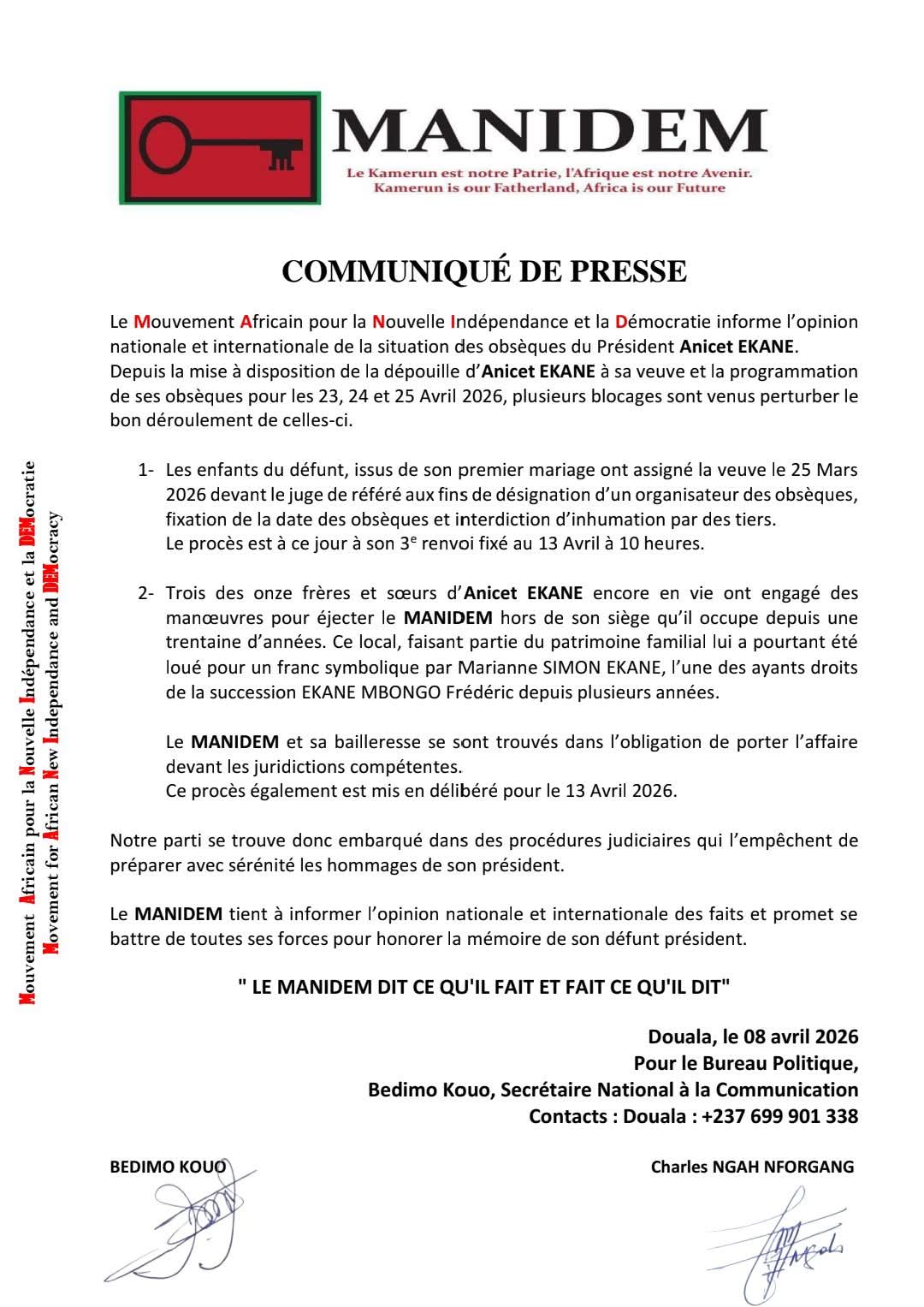 Rien ne se déroule comme prévu autour des obsèques d’Anicet Ekane. Alors que les cérémonies sont annoncées du 23 au 25 avril 2026, plusieurs litiges viennent perturber leur organisation. Dans un communiqué signé le 08 avril 2026, le Manidem évoque une situation délicate qui freine les préparatifs.